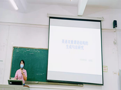 接着进行分享的是袁素雯老师。袁老师以“英语双重谓语结构的生成句法研究”为题,从学习内容、学习成果、学习心得三个方面进行分享,展示了已发表及即将发表的论文,在学习心得中分享了值得学习、借鉴的建议。