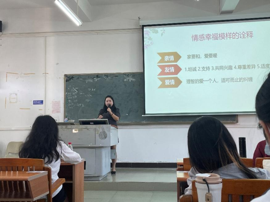 紧接着,王妙纯女士诠释情感幸福模样主要分为三类:亲情、友情和爱情。王妙纯女士指出“亲情”就是家和万事兴,爱要暖。通过分享自己与家人之间朝夕相处,得出“爱要大声说出口”的结论。“友情”是需要双方之间相互坦诚、相互⽀持,有着共同兴趣爱好,彼此尊重差异、适度沟通。“有话直说,有事明说,相处时不用防备,聊天时毫无顾忌,这大概就是最好的友情。”这是王妙纯女士十分喜欢杨绛先生描述朋友之间的沟通模式的一句话,她认为朋友之间的相处是舒服的,开心的时候彼此分享,难过的时候彼此倾诉和分担,有什么事就直说,无需猜忌和隐藏。“爱情”就需要大家理智地爱⼀个⼈,要学会适可而止地纠缠。