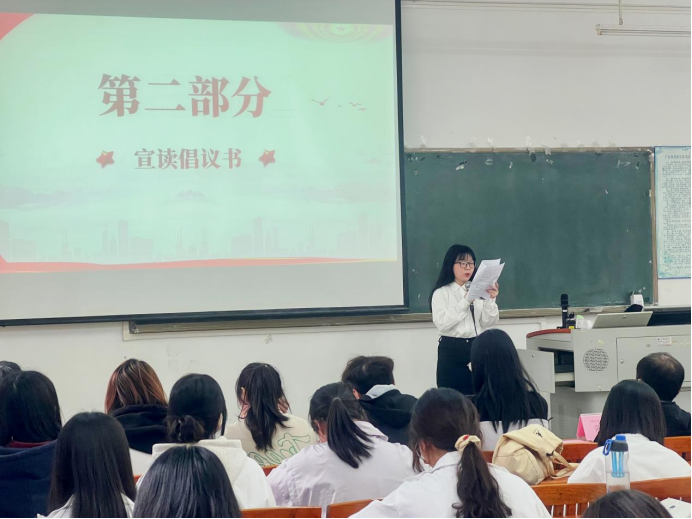 教师代表郭宇洁老师介绍了本次活动的主要内容和活动安排,她呼吁广大同学积极参与本月开展的各项活动,希望学生骨干要时刻发挥先锋模范作用,带动身边同学一起争做文明青年。她强调同学们在日常学习中要注意课堂的纪律、保持课室卫生;生活中要团结同学、保持宿舍卫生,严格遵守校规校纪律。最后,希望同学们在本次活动中有所收获,得到成长。