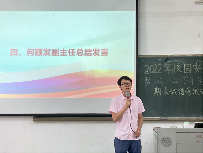 会议第四项,何顺发副主任总结发言。他总结道,第一,树立安全第一的意识,叮嘱学生注意安全问题,外出尽量结伴同行,牢记“生命重于泰山”;疫情期间,注意自我防护,切勿到中高风险地区参加活动;若身体不适,需及时上报并就医。第二,坚守诚信考试的底线,切勿存在侥幸心理,一旦发现作弊将取消授予学士学位资格,希望同学们诚信考试,对自己负责,也对集体负责。第三,调整自身备考的状态,认真复习的同时要懂得缓解压力,以良好的心态面对考试。